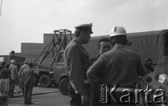 9.05.1980, Warszawa, Polska. Obchody Dnia Zwycięstwa na Placu Zwycięstwa (obecnie Plac Józefa Piłsudskiego). Przed budynkiem Teatru Wielkiego obok samochodu stoi I sekretarz Komitetu Centralnego Polskiej Zjednoczonej Partii Robotniczej Edward Gierek w towarzystwie generała ludowego Wojska Polskiego. Fot. Edward Grochowicz, zbiory Ośrodka KARTA