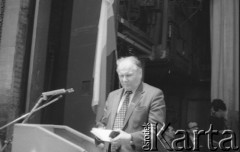 1.05.1981, Warszawa, Polska. Przedstawiciele władz partyjnych i państwowych na obchodach święta 1 Maja na Placu Teatralnym. Stoją od lewej: marszałek Sejmu Stanisław Gucwa, sekretarz Komitetu Warszawskiego PZPR Stanisław Kociołek, NN, I sekretarz KC PZPR Stanisław Kania, członek KC PZPR Felicja Fornalska, premier gen. Wojciech Jaruzelski, wicepremier i przewodniczący Stronnictwa Narodowego Edward Kowalczyk. Fot. Edward Grochowicz, zbiory Ośrodka KARTA