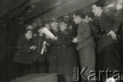 11.11.1940, Targu-Jiu, Rumunia. Obóz internowania dla żołnierzy Wojska Polskiego - zespół Teatru Żołnierza Polskiego po zakończonej jednoaktówce autorstwa kpt. Józefa Bzowskiego pt. "Dla Twojej Chwały". Na zdjęciu aktorzy przebrani w repliki mundurów z okresu Powstania Listopadowego, stroje Krakowiaków, ubrania cywilne. Pozostali członkowie zespołu w mundurach regulaminowych WP różnych formacji. Fot. NN, zbiory Ośrodka Karta, album (A-XIII). Zdjęcie ze zbioru ocalonego przez pracownika ambasady PRL w Bukareszcie Jerzego Polakowskiego