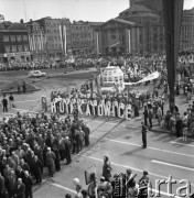 Kwiecień 1958, Katowice, Polska. Przechodnie na ulicy, w tle budynek Teatru Śląskiego. Fot. Romuald Broniarek, zbiory Ośrodka KARTA