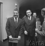 Maj 1975, Warszawa, Polska. Teatr Polski, podpisanie umowy o współpracy z moskiewskim MChAT-em. Z lewej siedzi dyrektor Teatru Polskiego, aktor August Kowalczyk. Fot. Romuald Broniarek/KARTA