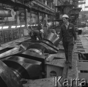 Lata70-te, Bielsko-Biała, woj. Katowice, Polska. Pilotka i instruktorka szybowcowa Pelagia Majewska w hali produkcyjnej Doświadczalnych Zakładów Szybowcowych, z prawej stoi podpułkownik Ludowego Wojska Polskiego. Fot. Kazimierz Seko, zbiory Ośrodka KARTA