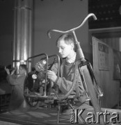 1948, Katowice, Polska. Ogólnopolskie Zawody Modeli Latających, mężczyzna pokazujący śmigła i silniki modeli. Fot. Kazimierz Seko, zbiory Ośrodka KARTA