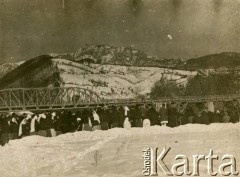 Lata 20-te, Stołpce, woj. Nowogródek, Polska. Polsko-sowieckie przejście graniczne i brama powitalna w Stołpcach, napis nad torami kolejowymi: "Pozdrawiamy robotników Zachodu", w głębi budynek radzieckiej strażnicy. Fot. NN, zbiory Ośrodka KARTA, Pogotowie Archiwalne [PAF_052], udostępnił Wiesław Gawinek