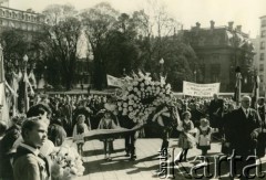 31.07.1955 - 4.08.1955, Warszawa, Polska. V Światowy Festiwal Młodzieży i Studentów o Pokój i Przyjaźń. Uczestnicy festiwalu - górnicy z kobietami w strojach ludowych. Fot. Irena Jarosińska, zbiory Ośrodka KARTA