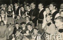 1954, Kokoszkowy, Polska Zespół taneczny z Rolniczego Zespołu Spółdzielni "Zdobycz Chłopska". Na ścianie wisi portret Bolesława Bieruta. Fot. Irena Jarosińska, zbiory Ośrodka KARTA
