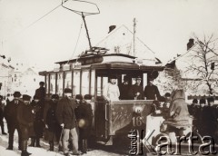 25.08.1974, Warszawa, Polska. Plac Starynkiewicza, zwiedzanie miasta zabytkowym tramwajem, napis: "MZK, Warszawa wczoraj i dziś, codziennie z przewodnikiem o godz. 10 i 19". Fot. Jarosław Tarań, zbiory Ośrodka KARTA [74-103]