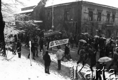 4.05.1981, Warszawa, Polska. Wizyta biskupa Zbigniewa Kraszewskiego (trzyma kwiaty), sufragana warszawskiego w Hucie Warszawa - przejście ulicą Jana Kasprowicza. Obok biskupa idzie ksiądz Jerzy Popiełuszko, Karol Szadurski (w jasnym płaszczu) i Jacek Lipiński. W głębi m.in.: Seweryn Jaworski (w okularach) oraz hutnicy z transparentem: "Witamy Arcypasterza". Fot. Adam Szymański, zbiory Ośrodka KARTA, kolekcję zdjęć przekazał Adam Szymański
