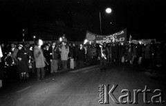3.11.1984, Warszawa, Polska. Pogrzeb księdza Jerzego Popiełuszki w Kościele św. Stanisława Kostki na warszawskim Żoliborzu - wierni oraz transparent z napisem: "Uderzenie w serce narodu" zawieszony na ogrodzeniu kościoła. Fot. NN, zbiory Ośrodka KARTA