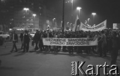 31.08.1982, Warszawa, Polska. Manifestacja zorganizowana przez Solidarność w drugą rocznicę podpisania "porozumień sierpniowych". Ludzie zgromadzeni przy ul. Świętojańskiej przed katedrą św. Jana z transparentem "Uwolnić Solidarność". Fot. Maciej Czarnocki, zbiory Ośrodka KARTA