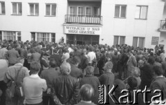 6.02.1989, Warszawa, Polska. Pałac Namiestnikowski przy Krakowskim Przedmieściu, siedziba Urzędu Rady Ministrów, tłum zgromadzony przed bramą podczas obrad Okrągłego Stołu. Transparenty: "NZS SGPiS" i "Lechu zaufaliśmy Tobie. Solidarność". Fot. Jarosław Tarań, zbiory Ośrodka KARTA [89-25]