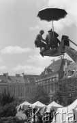 27.12.1968, Warszawa, Polska. Próba do telewizyjnego przedstawienia pt.: "Wieczór Wigilijny" - aktorzy z parasolami. Widok z góry na scenę, ekipę realizującą spektakl oraz sprzęt telewizyjny: kamerę, mikrofony oraz lampy. Fot. Jarosław Tarań, zbiory Ośrodka KARTA