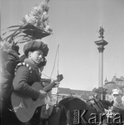 1.05.1986, Warszawa, Polska. Pochód pierwszomajowy, ojciec z dzieckiem na ramionach, z tyłu idą uczniowie Zespołu Szkół Samochodowych nr 2. Fot. Jarosław Tarań, zbiory Ośrodka KARTA [86-60]