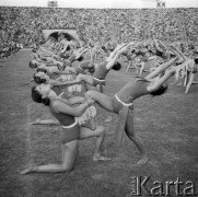 Sierpień 1964, Warszawa, Polska. Próba centralnych dożynek na Stadionie Dziesięciolecia, grupa dziewcząt w sportowych strojach podczas pokazów gimnastyki artystycznej. Fot. Romuald Broniarek/KARTA