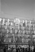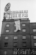 1981, Kraków, Polska. Mężczyzna idzie obok tablicy z napisem: "Budujemy Polskę dla was, ale razem z wami". Obok tablica z napisem: "ZSMP". Fot. Jerzy Szot, zbiory Ośrodka KARTA