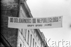 listopad 1981, Kraków, Polska. Marsz wolności zorganizowany w obronie aresztowanego działacza KPN Leszka Moczulskiego. Manifestanci niosą transparenty z napisami: "Uwolnić politycznych", „Dzisiaj sądzą działaczy KPN, jutro działaczy „Solidarność”, następnym będziesz Ty”, „Patrząc biernie na procesy polityczne – akceptujesz, popierasz je”. Fot. Jerzy Szot, zbiory Ośrodka KARTA
