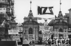 24.05.1989, Warszawa, Polska. Strajk okupacyjny studentów Uniwersytetu Warszawskiego (UW), ogłoszony po odrzuceniu wniosku o rejestrację Niezależnego Zrzeszenia Studentów (NZS) przez Sąd Wojewódzki w Warszawie. Na zdjęciu transparenty przy bramie głównej do uniwersytetu, m.in. z hasłami: "Żądamy zniesienia cenzury", "Dziś uczelnie, jutro zakłady", "Racja po stronie NZS", Wolność Chinom". Zdjęcie wykonane drugiego dnia strajku przed południem. Fot. Stanisław Maliszewski, zbiory Ośrodka KARTA
