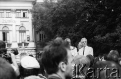 12.06.1981, Lublin, Polska. Wizyta Czesława Miłosza w Polsce po otrzymaniu Literackiej Nagrody Nobla. Poeta na dziedzińcu Katolickiego Uniwersytetu Lubelskiego. Obok niego stoją Lech Wałęsa i profesor Jerzy Kłoczowski (z lewej). Fot. Tomasz Tomaszewski, zbiory Ośrodka KARTA.