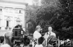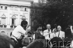 24.05.1989, Warszawa, Polska. Strajk okupacyjny studentów Uniwersytetu Warszawskiego (UW), ogłoszony po odrzuceniu wniosku o rejestrację Niezależnego Zrzeszenia Studentów (NZS) przez Sąd Wojewódzki w Warszawie. Na zdjęciu od prawej: francuski aktor i piosenkarz Yves Montand, Andrzej Łapicki, Maciej Jankowski i NN przed gmachem Biblioteki UW, podczas spotkania ze strajkującymi studentami. Zdjęcie wykonane drugiego dnia strajku przed południem. Fot. Stanisław Maliszewski, zbiory Ośrodka KARTA