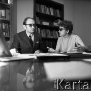 1970, Warszawa, Polska. Ewa Długosz, urodzona w obozie koncentracyjnym Ravensbruck, n/z podczas konsultacji swojej pracy naukowej, z lewej prof. Zbigniew Czeczot. Fot. Irena Jarosińska, zbiory Ośrodka KARTA