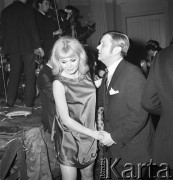 1.01.1968, Warszawa, Polska. Bal WAG. Aktorka Elżbieta Czyżewska rozmawia z reżyserem Jerzym Gruzą, który trzyma w ręku ogórka. Fot. Jarosław Tarań, zbiory Ośrodka KARTA