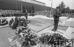 1.05.1981, Warszawa, Polska. Przedstawiciele władz partyjnych i państwowych na obchodach święta 1 Maja na Placu Teatralnym. I sekretarz Komitetu Warszawskiego PZPR Stanisław Kociołek składa kwiaty pod Pomnikiem Bohaterów Warszawy (Nike). 1. z prawej stoi członek KC PZPR Felicja Fornalska. Fot. Edward Grochowicz, zbiory Ośrodka KARTA