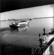 Lipiec 1962, Warszawa, Polska. Wędkarze pod mostem Śląsko-Dąbrowskim. W tle płynie statek wycieczkowy. Fot. Jarosław Tarań, zbiory Ośrodka KARTA [62-11]