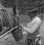 Lata 50. lub 60., okolice Krakowa, Polska. Mężczyzna napełnia wiadro wodą ze studni. Fot. Irena Jarosińska, zbiory Ośrodka KARTA