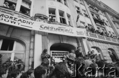Lipiec 1959, Katowice, Polska. Obchody piętnastolecia PRL. Na trybunie stoją m.in: Nikita Chruszczow, Edward Gierek i Władysław Gomułka, w tle wisi portret Włodzimierza Lenina. Na ścienie budynku z prawej wisi transparent: "Niech żyje wieczysta przyjaźń polsko-radziecka". Fot. Romuald Broniarek/KARTA