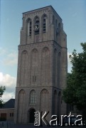 1993, Kraków, Polska. Krakowski Kazimierz - wieża kościoła. Na pierwszym planie kwiaty. Fot. Jerzy Szot, zbiory Ośrodka KARTA