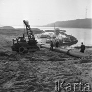 Wrzesień 1957, Warszawa, Polska. Budowa Mostu Gdańskiego na filarach i z wykorzystaniem niektórych elementów konstrukcyjnych zburzonego Mostu przy Cytadeli. Fot. Romuald Broniarek, zbiory Ośrodka KARTA