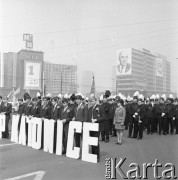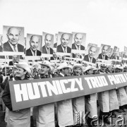1.05.1959, Warszawa, Polska. Obchody święta 1 Maja, pochód przechodzący ulicą Marszałkowską, na pierwszym planie dziennikarze robiący zdjęcia i hutnicy niosący transparent z napisem propagandowym "Produkcja stali w 1965 wyniesie 344000 ton". Po lewej fragment trybuny honorowej, na niej w oddali, w jasnym kapeluszu prezydent Indonezjii Ahmed Sukarno, na lewo od niego I sekretarz KC PZPR Władysław Gomułka, na prawo przewodniczący Rady Państwa Aleksander Zawadzki. Fot. Romuald Broniarek, zbiory Ośrodka KARTA