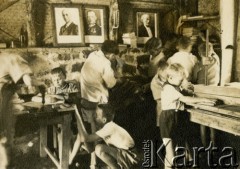 12.02.1945, Valivade, Indie. Oryginalny podpis: "Zakład Wychowawczy im.gen. Władysława Sikorskiego w Valivade. Chłopcy zajęci oprawą książek we własnej introligatorni". Na ścianie portrety Władysława Raczkiewicza, Władysława Sikorskiego i Ignacego Paderewskiego. [Osiedle stałe w Valivade zostało wybudowane wiosną 1943 dla polskich uchodźców (głównie kobiet z dziećmi), którzy trafili do Iran.u wraz z nowoutworzonym Wojskiem Polskim pod dowództwem generała Władysława Andersa. Posiadało m.in. polską administrację samorządową, kościół, teatr, sklepy, cukiernie, szpitale, straż pożarną. W latach 1943–1947 przez osiedle przeszło około pięciu tysięcy Polaków]. Fot. NN, zbiory Ośrodka KARTA, kolekcja Adeli Duszy przekazała Halina Guść