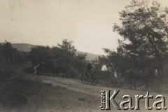 Lata 50. lub 60., woj. białostockie, Polska. Wieś. Grupa osób przy wozie zaprzęgniętym w konia. Fot. Irena Jarosińska, zbiory Ośrodka KARTA