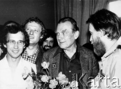 1978-1979, prawdopodobnie Konstancin k/Warszawy. Konspiracyjna drukarnia Niezależnej Oficyny Wydawniczej NOWa, stoją od lewej: Antoni Roszak, Zenon Pałka, Mirosław Chojecki, Wojciech Onyszkiewicz, Konrad Bieliński. Fot. Marcin Jabłoński, zbiory Ośrodka KARTA