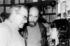 1981, Warszawa, Polska. Spotkanie przedstwicieli środowisk opozycyjnych. Na zdjęciu: ksiądz Jan Zieja rozmawia z mężczyzną. Fot. NN, zbiory Ośrodka KARTA/Independent Polish Agency (IPA), przekazał Józef Lebenbaum