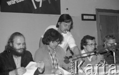 wrzesień 1981, Warszawa, Polska. Spotkanie niezależnych wydawców w siedzibie Regionu Mazowsze NSZZ "Solidarność" na ulicy Mazowieckiej. Na zdjęciu: uczestnicy spotkania od lewej: NN, Andrzej Rosner, Bogdan Grzesiak (stoi), Grzegorz Boguta, Marek Borowik. Fot. NN, zbiory Ośrodka KARTA/Independent Polish Agency (IPA), przekazał Józef Lebenbaum