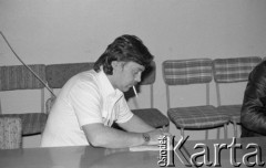 wrzesień 1981, Warszawa, Polska. Spotkanie niezależnych wydawców w siedzibie Regionu Mazowsze NSZZ "Solidarność" na ulicy Mazowieckiej. Na zdjęciu Bogdan Grzesiak pali papierosa. Fot. NN, zbiory Ośrodka KARTA/Independent Polish Agency (IPA), przekazał Józef Lebenbaum
