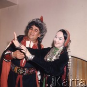 Kwiecień 1975, Warszawa, Polska. Dni Kultury Radzieckiej, występy zespołów folklorystycznych, tancerze w strojach regionalnych za kulisami. Fot. Romuald Broniarek/KARTA
