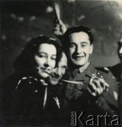 1.01.1968, Warszawa, Polska. Bal WAG. Aktorka Elżbieta Czyżewska rozmawia z reżyserem Jerzym Gruzą, który trzyma w ręku ogórka. Fot. Jarosław Tarań, zbiory Ośrodka KARTA