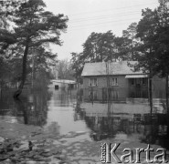 Marzec 1979, Wyszków okolice, woj. Ostrołęka, Polska. Powódź - widok na podtopioną zabudowę mieszkalną oraz drzewa. Fot. Jarosław Tarań, zbiory Ośrodka KARTA [79-23]