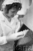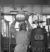 1968, Warszawa, Polska. Pracownica Zakładów Farmaceutycznych "Polfa" sprawdzająca jakość preparatów w menzurkach. Fot. Jarosław Tarań, zbiory Ośrodka KARTA