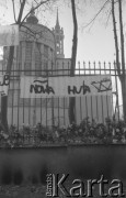3.11.1984, Warszawa, Polska. Pogrzeb księdza Jerzego Popiełuszki w Kościele św. Stanisława Kostki na warszawskim Żoliborzu - wierni uczestniczą we mszy. Na ogrodzeniu kościoła widoczne są transparenty: "Ksiądz Jerzy. Żegna Cię Region Pomorze Zachodnie.", "Ksiądz Jerzy Świętym Jerzym naszych czasów". Fot. NN, zbiory Ośrodka KARTA