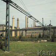 Październik 1975, Dąbrowa Górnicza, woj. Katowice, Polska. Budowa Huty Katowice, montaż dźwigów, z prawej komin elektrociepłowni. Fot. Romuald Broniarek/KARTA