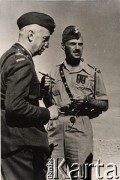 1946, Lys-lez-Lannoy, Francja, Francja. Pisarz i dziennikarz Melchior Wańkowicz w towarzystwie żołnierza 2. Dywizji Strzelców Pieszych w Obozie Zbornym Wojska Polskiego. Fot. Jerzy Konrad Maciejewski, zbiory Ośrodka KARTA