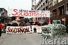 Sierpień 1988, Gdańsk, Polska. Regionalna Komisja Koordynacyjna NSZZ „Solidarność” wezwała do rozpoczęcia strajku w całym Regionie Gdańskim. "Stanęły" m.in. stocznie Gdańska im. Lenina, Remontowa, Wisła i Radunia. Na zdjęciu brama wjazdowa do Gdańskiej Stoczni Remontowej, na której powieszono transparenty z napisami: "Nie ma wolności bez Solidarności" oraz "Solidarność". Przed bramą stoi również mały pojazd przypominający wyglądem samochód ZOMO. Fot. Stanisław Składanowski, zbiory Ośrodka KARTA