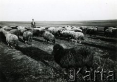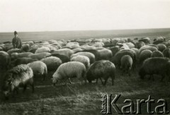 20.05.1975, Stary Sącz, Polska Dzień targowy, mężczyzna prowadzący owce. Fot. Jarosław Tarań, zbiory Ośrodka KARTA [75-299]