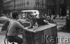 1930-1950, miejsce nieznane, Polska. Mężczyzna w jeziorze. Trzyma psy. Fot. NN, kolekcja rodziny Walińskich, zbiory Fundacji Ośrodka KARTA